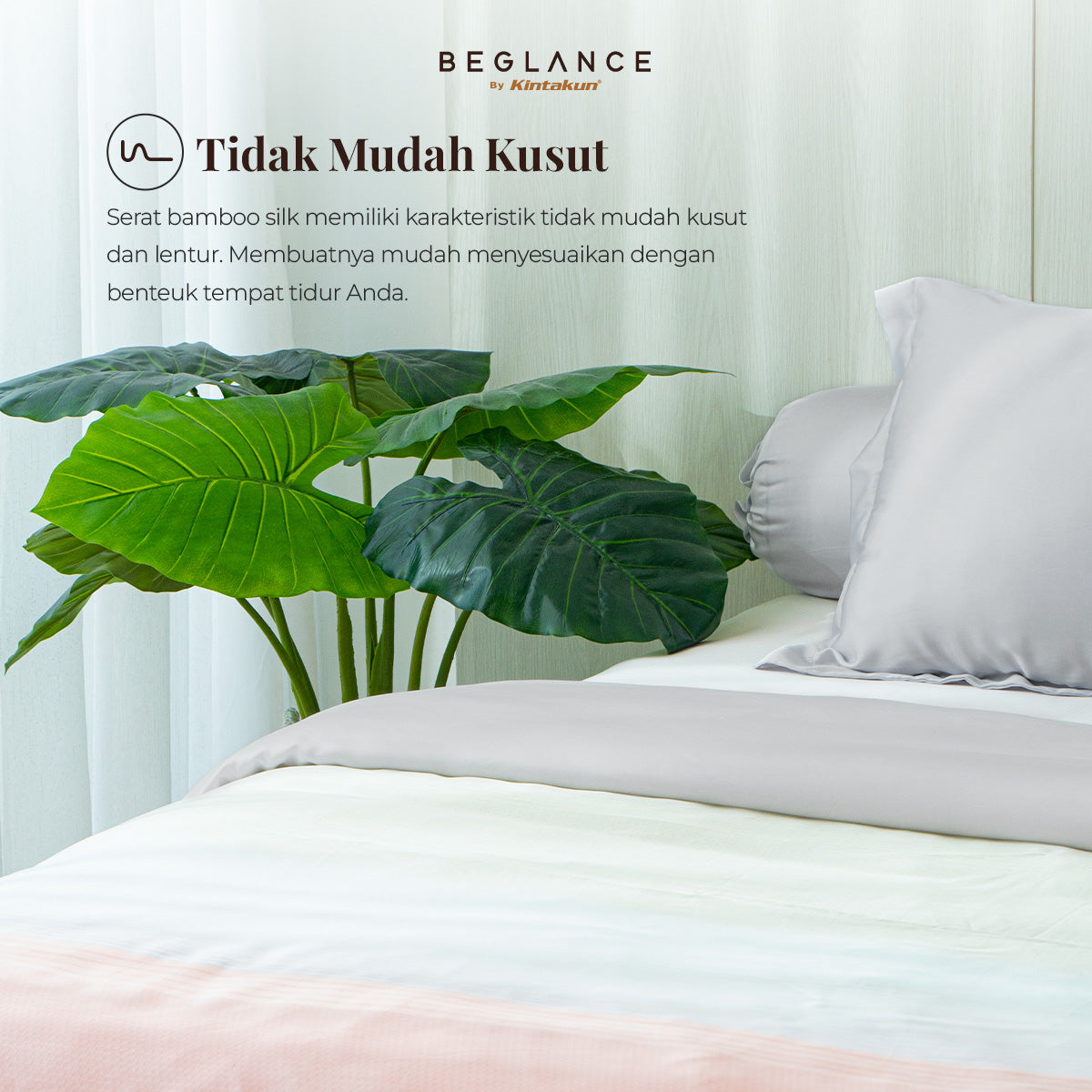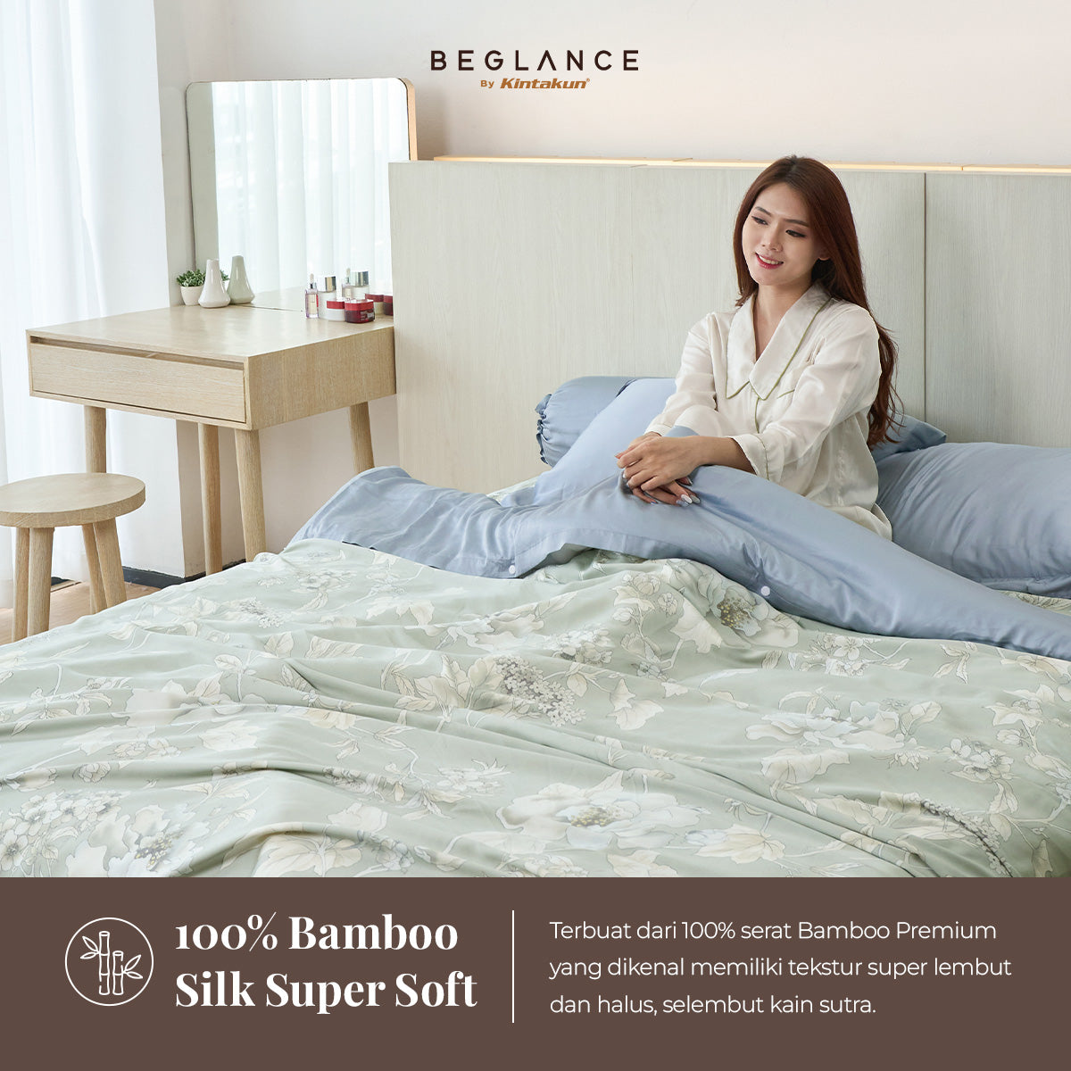 Melepas lelah di kamar tidur yang memberikan pengalaman tidur terbaik dengan BEGLANCE by Kintakun Bamboo Silk. Terbuat dari 100% serat bamboo silk super soft, serat alami ramah lingkungan, yang super lembut dan halus, selembut kain sutra. Memberikan sentuhan dingin (cooling touch), menyerap kelembaban yang optimal, sehingga membuat Anda tetap sejuk saat tertidur.