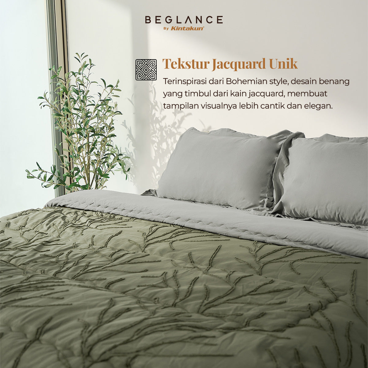 Tingkatkan kenyamanan tidur dengan bed cover premium dari BEGLANCE by Kintakun, Terbuat dari 100% premium microsuede yang super lembut, halus & cocok untuk semua musim. Dilengkapi dengan motif tactile unik yang timbul dari kain jacquard, sehingga membuat tampilan visual lebih menarik. Mengangkat tema bohemian, perpaduan motif dan tekstur kain pada koleksi ini, menambah keunikan kamarmu.