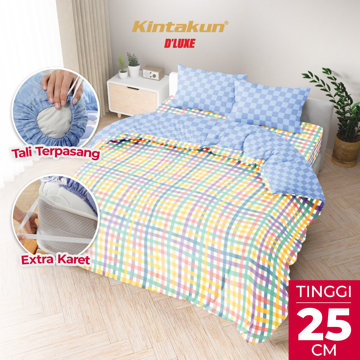 Bed cover Kintakun D’LUXE dengan tinggi 25 cm lebih pas untuk menutupi semua bagian permukaan kasur. Ditambah dengan karet penahan ekstra di setiap sudutnya dan ditambah dengan karet diagonal, sehingga membuat kasur selalu rapi dan tidak mudah berantakan. Anti ribet dan praktis karena tali pada sarung guling sudah terpasang rapi. Pilihan ideal untuk meningkatkan kenyamanan tidur. Dibuat dari serat microtex yang dilengkapi dengan Teknologi Hi-Breath menghasilkan kain yang lebih lembut, halus, menyerap keringat lebih cepat, anti gerah dan nyaman di kulit. Ditambah dengan Disperse Printing yang membuat motif sprei tidak luntur dan lebih nyata. Mempunyai sertifikat K3L sehingga sprei lebih aman. Kualitas terjamin dan harga terbaik di kelasnya. Bangga buatan Indonesia!