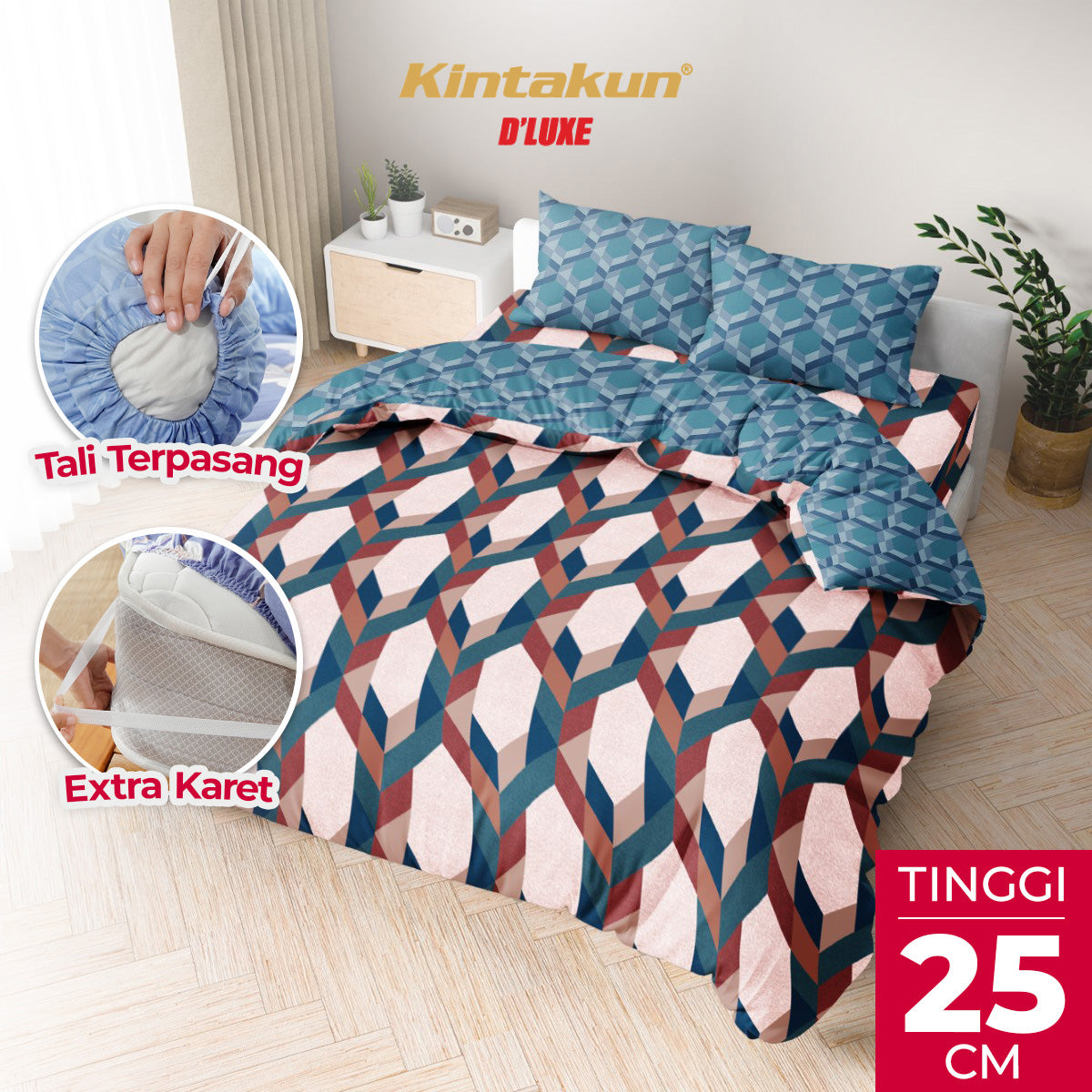 Bed cover Kintakun D’LUXE dengan tinggi 25 cm lebih pas untuk menutupi semua bagian permukaan kasur. Ditambah dengan karet penahan ekstra di setiap sudutnya dan ditambah dengan karet diagonal, sehingga membuat kasur selalu rapi dan tidak mudah berantakan. Anti ribet dan praktis karena tali pada sarung guling sudah terpasang rapi. Pilihan ideal untuk meningkatkan kenyamanan tidur. Dibuat dari serat microtex yang dilengkapi dengan Teknologi Hi-Breath menghasilkan kain yang lebih lembut, halus, menyerap keringat lebih cepat, anti gerah dan nyaman di kulit. Ditambah dengan Disperse Printing yang membuat motif sprei tidak luntur dan lebih nyata. Mempunyai sertifikat K3L sehingga sprei lebih aman. Kualitas terjamin dan harga terbaik di kelasnya. Bangga buatan Indonesia!