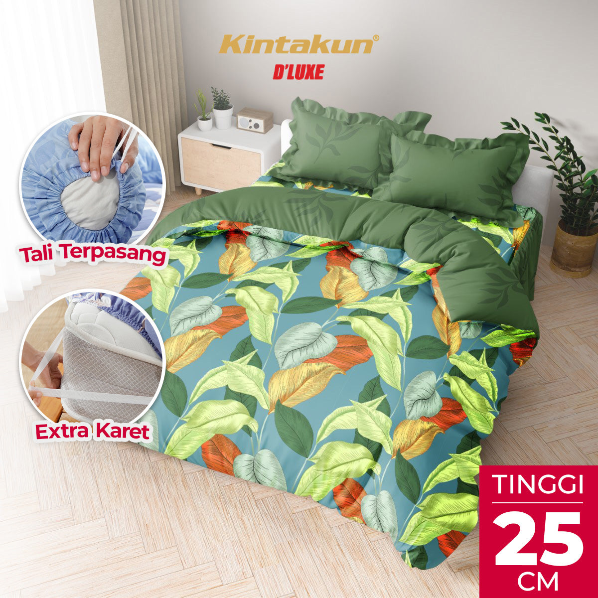 Bed cover Kintakun D’LUXE dengan tinggi 25 cm lebih pas untuk menutupi semua bagian permukaan kasur. Ditambah dengan karet penahan ekstra di setiap sudutnya dan ditambah dengan karet diagonal, sehingga membuat kasur selalu rapi dan tidak mudah berantakan. Anti ribet dan praktis karena tali pada sarung guling sudah terpasang rapi. Pilihan ideal untuk meningkatkan kenyamanan tidur. Dibuat dari serat microtex yang dilengkapi dengan Teknologi Hi-Breath menghasilkan kain yang lebih lembut, halus, menyerap keringat lebih cepat, anti gerah dan nyaman di kulit. Ditambah dengan Disperse Printing yang membuat motif sprei tidak luntur dan lebih nyata. Mempunyai sertifikat K3L sehingga sprei lebih aman. Kualitas terjamin dan harga terbaik di kelasnya. Bangga buatan Indonesia!
