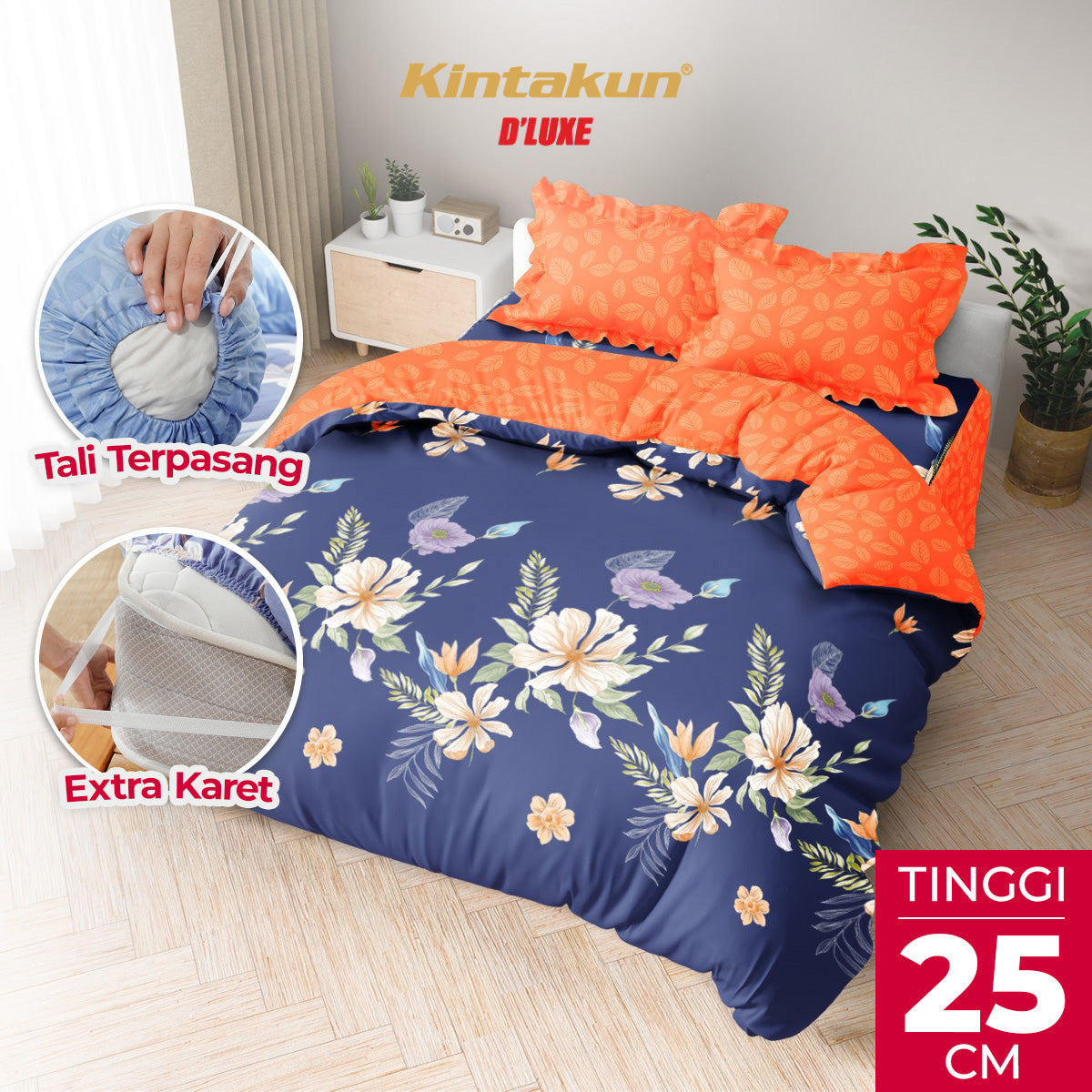 Bed cover Kintakun D’LUXE dengan tinggi 25 cm lebih pas untuk menutupi semua bagian permukaan kasur. Ditambah dengan karet penahan ekstra di setiap sudutnya dan ditambah dengan karet diagonal, sehingga membuat kasur selalu rapi dan tidak mudah berantakan. Anti ribet dan praktis karena tali pada sarung guling sudah terpasang rapi. Pilihan ideal untuk meningkatkan kenyamanan tidur. Dibuat dari serat microtex yang dilengkapi dengan Teknologi Hi-Breath menghasilkan kain yang lebih lembut, halus, menyerap keringat lebih cepat, anti gerah dan nyaman di kulit. Ditambah dengan Disperse Printing yang membuat motif sprei tidak luntur dan lebih nyata. Mempunyai sertifikat K3L sehingga sprei lebih aman. Kualitas terjamin dan harga terbaik di kelasnya. Bangga buatan Indonesia!