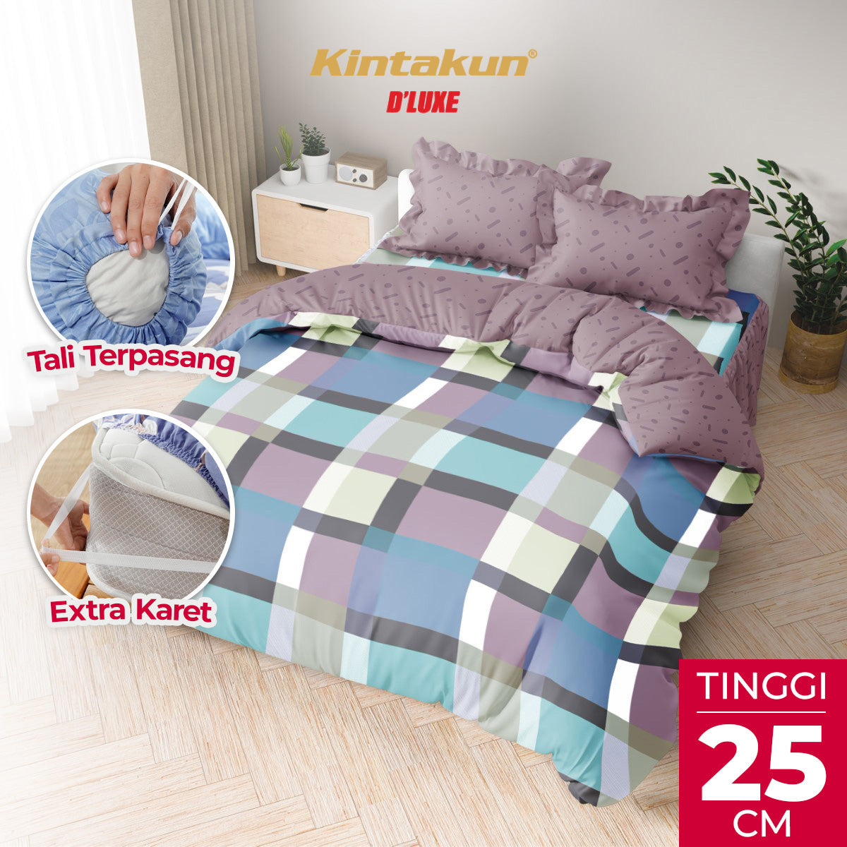 Bed cover Kintakun D’LUXE dengan tinggi 25 cm lebih pas untuk menutupi semua bagian permukaan kasur. Ditambah dengan karet penahan ekstra di setiap sudutnya dan ditambah dengan karet diagonal, sehingga membuat kasur selalu rapi dan tidak mudah berantakan. Anti ribet dan praktis karena tali pada sarung guling sudah terpasang rapi. Pilihan ideal untuk meningkatkan kenyamanan tidur. Dibuat dari serat microtex yang dilengkapi dengan Teknologi Hi-Breath menghasilkan kain yang lebih lembut, halus, menyerap keringat lebih cepat, anti gerah dan nyaman di kulit. Ditambah dengan Disperse Printing yang membuat motif sprei tidak luntur dan lebih nyata. Mempunyai sertifikat K3L sehingga sprei lebih aman. Kualitas terjamin dan harga terbaik di kelasnya. Bangga buatan Indonesia!