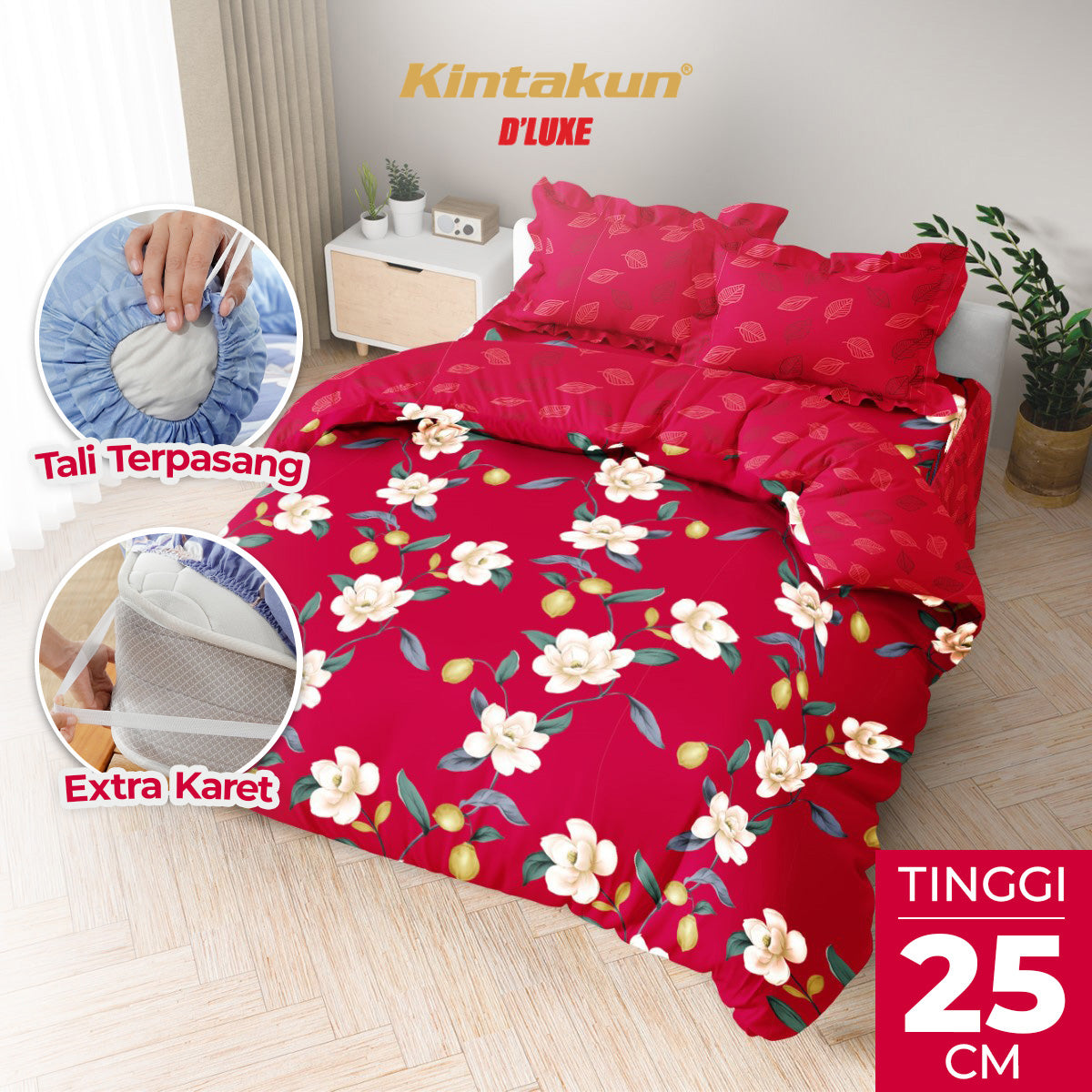 Bed cover Kintakun D’LUXE dengan tinggi 25 cm lebih pas untuk menutupi semua bagian permukaan kasur. Ditambah dengan karet penahan ekstra di setiap sudutnya dan ditambah dengan karet diagonal, sehingga membuat kasur selalu rapi dan tidak mudah berantakan. Anti ribet dan praktis karena tali pada sarung guling sudah terpasang rapi. Pilihan ideal untuk meningkatkan kenyamanan tidur. Dibuat dari serat microtex yang dilengkapi dengan Teknologi Hi-Breath menghasilkan kain yang lebih lembut, halus, menyerap keringat lebih cepat, anti gerah dan nyaman di kulit. Ditambah dengan Disperse Printing yang membuat motif sprei tidak luntur dan lebih nyata. Mempunyai sertifikat K3L sehingga sprei lebih aman. Kualitas terjamin dan harga terbaik di kelasnya. Bangga buatan Indonesia!