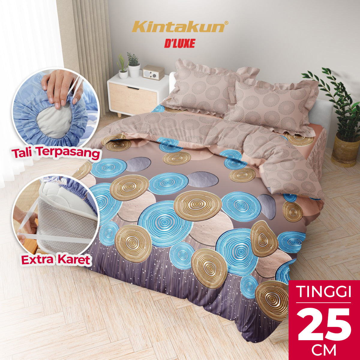 Bed cover Kintakun D’LUXE dengan tinggi 25 cm lebih pas untuk menutupi semua bagian permukaan kasur. Ditambah dengan karet penahan ekstra di setiap sudutnya dan ditambah dengan karet diagonal, sehingga membuat kasur selalu rapi dan tidak mudah berantakan. Anti ribet dan praktis karena tali pada sarung guling sudah terpasang rapi. Pilihan ideal untuk meningkatkan kenyamanan tidur. Dibuat dari serat microtex yang dilengkapi dengan Teknologi Hi-Breath menghasilkan kain yang lebih lembut, halus, menyerap keringat lebih cepat, anti gerah dan nyaman di kulit. Ditambah dengan Disperse Printing yang membuat motif sprei tidak luntur dan lebih nyata. Mempunyai sertifikat K3L sehingga sprei lebih aman. Kualitas terjamin dan harga terbaik di kelasnya. Bangga buatan Indonesia!