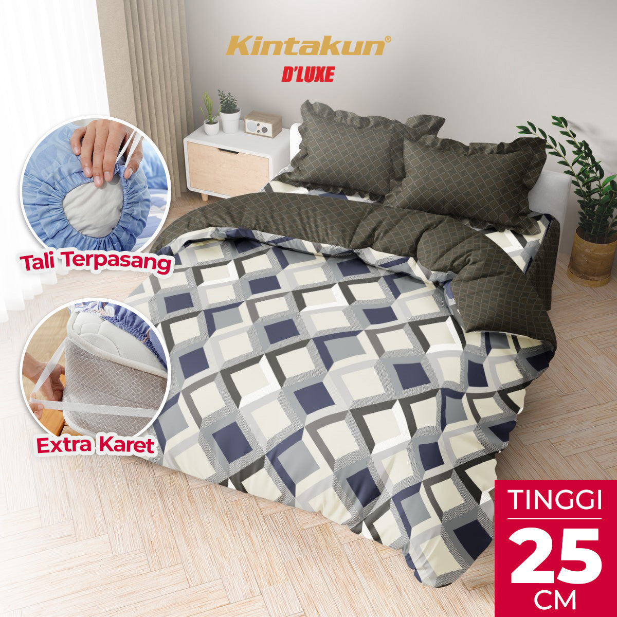 Bed cover Kintakun D’LUXE dengan tinggi 25 cm lebih pas untuk menutupi semua bagian permukaan kasur. Ditambah dengan karet penahan ekstra di setiap sudutnya dan ditambah dengan karet diagonal, sehingga membuat kasur selalu rapi dan tidak mudah berantakan. Anti ribet dan praktis karena tali pada sarung guling sudah terpasang rapi. Pilihan ideal untuk meningkatkan kenyamanan tidur. Dibuat dari serat microtex yang dilengkapi dengan Teknologi Hi-Breath menghasilkan kain yang lebih lembut, halus, menyerap keringat lebih cepat, anti gerah dan nyaman di kulit. Ditambah dengan Disperse Printing yang membuat motif sprei tidak luntur dan lebih nyata. Mempunyai sertifikat K3L sehingga sprei lebih aman. Kualitas terjamin dan harga terbaik di kelasnya. Bangga buatan Indonesia!