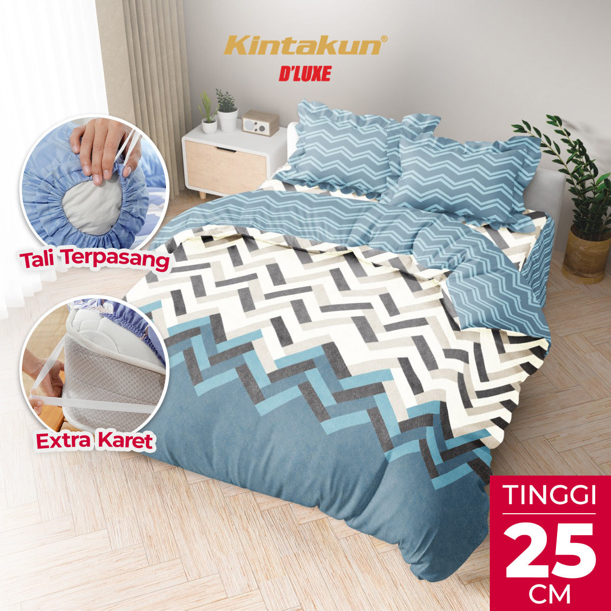 Bed cover Kintakun D’LUXE dengan tinggi 25 cm lebih pas untuk menutupi semua bagian permukaan kasur. Ditambah dengan karet penahan ekstra di setiap sudutnya dan ditambah dengan karet diagonal, sehingga membuat kasur selalu rapi dan tidak mudah berantakan. Anti ribet dan praktis karena tali pada sarung guling sudah terpasang rapi. Pilihan ideal untuk meningkatkan kenyamanan tidur. Dibuat dari serat microtex yang dilengkapi dengan Teknologi Hi-Breath menghasilkan kain yang lebih lembut, halus, menyerap keringat lebih cepat, anti gerah dan nyaman di kulit. Ditambah dengan Disperse Printing yang membuat motif sprei tidak luntur dan lebih nyata. Mempunyai sertifikat K3L sehingga sprei lebih aman. Kualitas terjamin dan harga terbaik di kelasnya. Bangga buatan Indonesia!