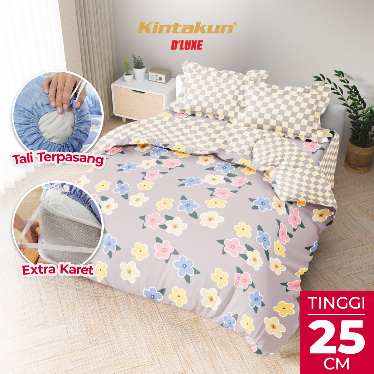 Bed cover Kintakun D’LUXE dengan tinggi 25 cm lebih pas untuk menutupi semua bagian permukaan kasur. Ditambah dengan karet penahan ekstra di setiap sudutnya dan ditambah dengan karet diagonal, sehingga membuat kasur selalu rapi dan tidak mudah berantakan. Anti ribet dan praktis karena tali pada sarung guling sudah terpasang rapi. Pilihan ideal untuk meningkatkan kenyamanan tidur. Dibuat dari serat microtex yang dilengkapi dengan Teknologi Hi-Breath menghasilkan kain yang lebih lembut, halus, menyerap keringat lebih cepat, anti gerah dan nyaman di kulit. Ditambah dengan Disperse Printing yang membuat motif sprei tidak luntur dan lebih nyata. Mempunyai sertifikat K3L sehingga sprei lebih aman. Kualitas terjamin dan harga terbaik di kelasnya. Bangga buatan Indonesia!