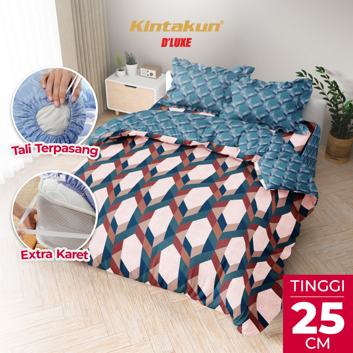 Bed cover Kintakun D’LUXE dengan tinggi 25 cm lebih pas untuk menutupi semua bagian permukaan kasur. Ditambah dengan karet penahan ekstra di setiap sudutnya dan ditambah dengan karet diagonal, sehingga membuat kasur selalu rapi dan tidak mudah berantakan. Anti ribet dan praktis karena tali pada sarung guling sudah terpasang rapi. Pilihan ideal untuk meningkatkan kenyamanan tidur. Dibuat dari serat microtex yang dilengkapi dengan Teknologi Hi-Breath menghasilkan kain yang lebih lembut, halus, menyerap keringat lebih cepat, anti gerah dan nyaman di kulit. Ditambah dengan Disperse Printing yang membuat motif sprei tidak luntur dan lebih nyata. Mempunyai sertifikat K3L sehingga sprei lebih aman. Kualitas terjamin dan harga terbaik di kelasnya. Bangga buatan Indonesia!