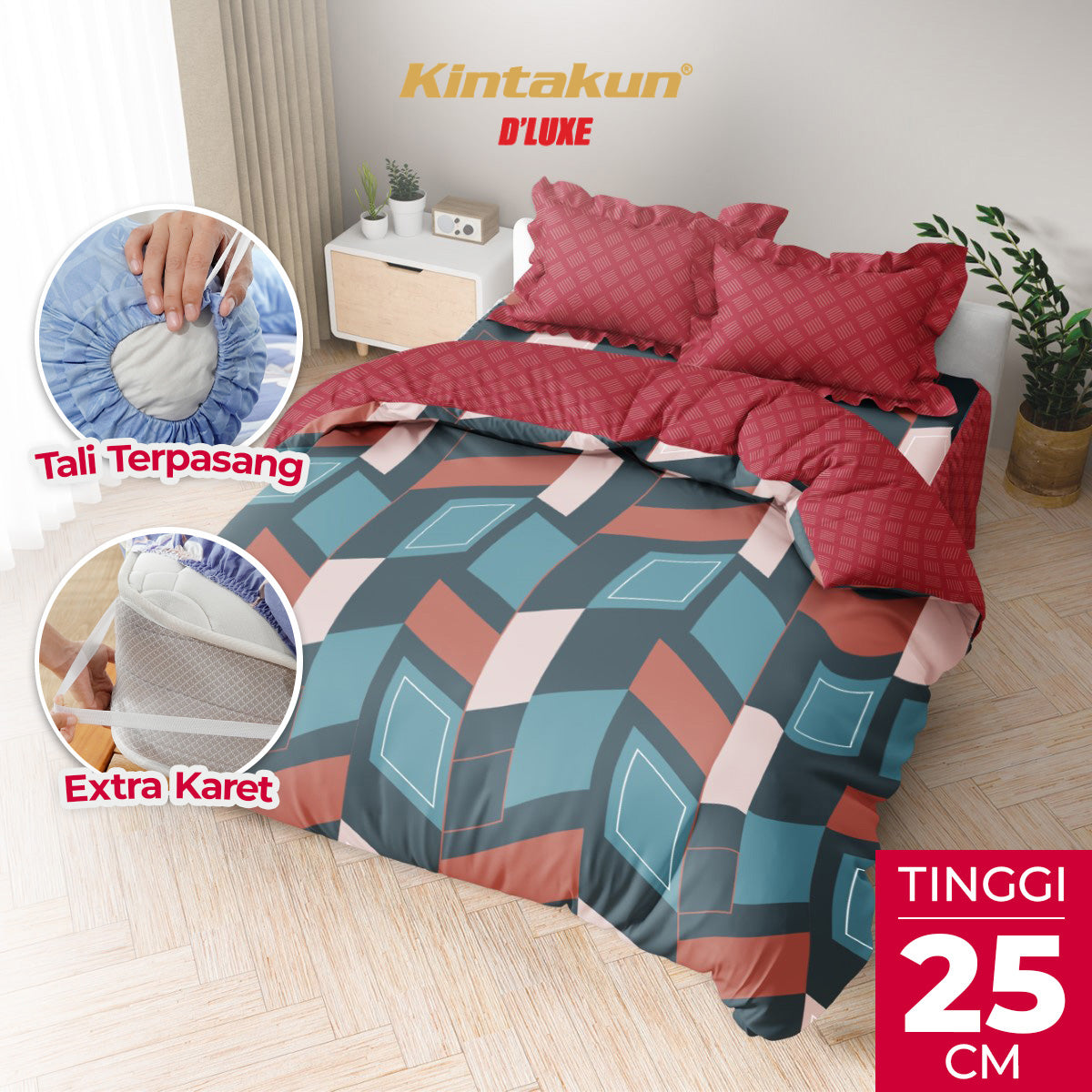 Bed cover Kintakun D’LUXE dengan tinggi 25 cm lebih pas untuk menutupi semua bagian permukaan kasur. Ditambah dengan karet penahan ekstra di setiap sudutnya dan ditambah dengan karet diagonal, sehingga membuat kasur selalu rapi dan tidak mudah berantakan. Anti ribet dan praktis karena tali pada sarung guling sudah terpasang rapi. Pilihan ideal untuk meningkatkan kenyamanan tidur. Dibuat dari serat microtex yang dilengkapi dengan Teknologi Hi-Breath menghasilkan kain yang lebih lembut, halus, menyerap keringat lebih cepat, anti gerah dan nyaman di kulit. Ditambah dengan Disperse Printing yang membuat motif sprei tidak luntur dan lebih nyata. Mempunyai sertifikat K3L sehingga sprei lebih aman. Kualitas terjamin dan harga terbaik di kelasnya. Bangga buatan Indonesia!