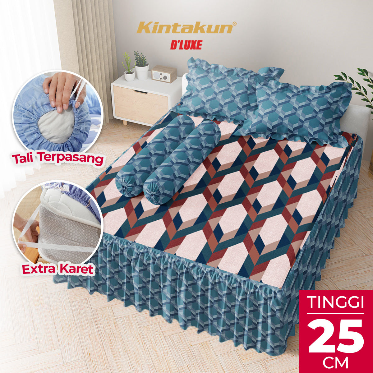Sprei Kintakun D’LUXE dengan tinggi 25 cm lebih pas untuk menutupi semua bagian permukaan kasur. Ditambah dengan karet penahan ekstra di setiap sudutnya dan ditambah dengan karet diagonal, sehingga membuat kasur selalu rapi dan tidak mudah berantakan. Anti ribet dan praktis karena tali pada sarung guling sudah terpasang rapi. Pilihan ideal untuk meningkatkan kenyamanan tidur. Dibuat dari serat microtex yang dilengkapi dengan Teknologi Hi-Breath menghasilkan kain yang lebih lembut, halus, menyerap keringat lebih cepat, anti gerah dan nyaman di kulit. Ditambah dengan Disperse Printing yang membuat motif sprei tidak luntur dan lebih nyata. Mempunyai sertifikat K3L sehingga sprei lebih aman. Kualitas terjamin dan harga terbaik di kelasnya. Bangga buatan Indonesia!