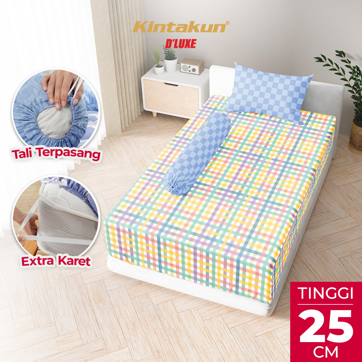Sprei Kintakun D’LUXE dengan tinggi 25 cm lebih pas untuk menutupi semua bagian permukaan kasur. Ditambah dengan karet penahan ekstra di setiap sudutnya dan ditambah dengan karet diagonal, sehingga membuat kasur selalu rapi dan tidak mudah berantakan. Anti ribet dan praktis karena tali pada sarung guling sudah terpasang rapi. Pilihan ideal untuk meningkatkan kenyamanan tidur. Dibuat dari serat microtex yang dilengkapi dengan Teknologi Hi-Breath menghasilkan kain yang lebih lembut, halus, menyerap keringat lebih cepat, anti gerah dan nyaman di kulit. Ditambah dengan Disperse Printing yang membuat motif sprei tidak luntur dan lebih nyata. Mempunyai sertifikat K3L sehingga sprei lebih aman. Kualitas terjamin dan harga terbaik di kelasnya. Bangga buatan Indonesia!
